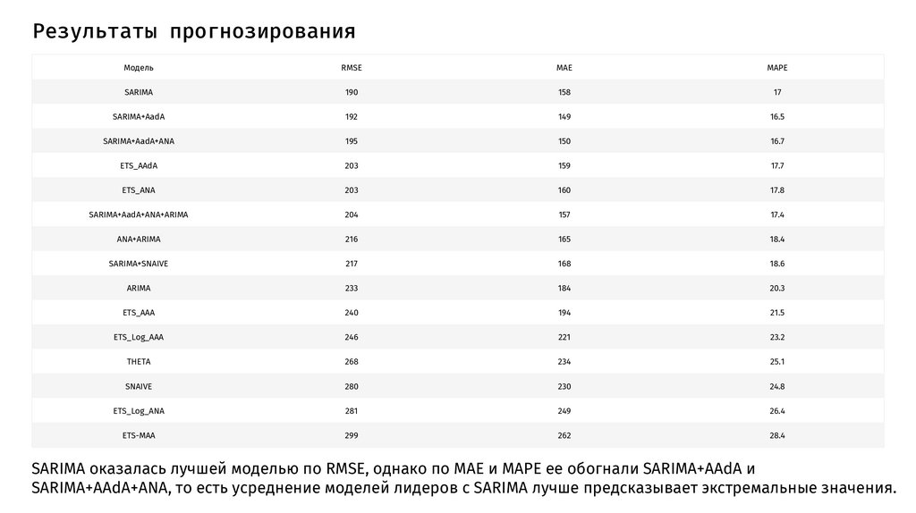 SARIMA оказалась лучшей моделью по RMSE, однако по MAE и MAPE ее обогнали SARIMA+AAdA и