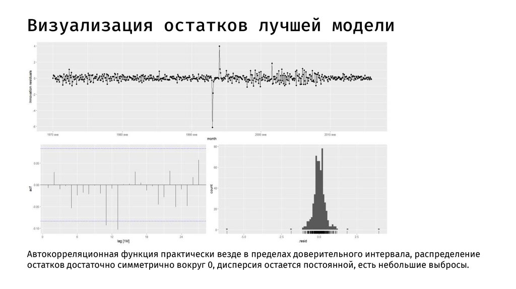 остатков достаточно симметрично вокруг 0, дисперсия остается постоянной, есть небольшие выбросы.