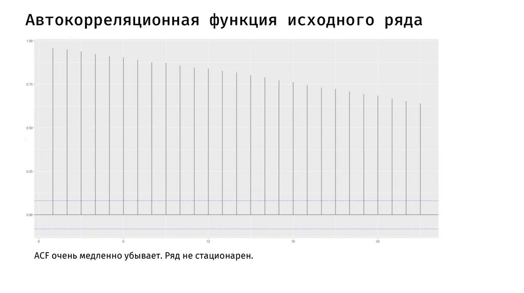 Автокорреляционная функция исходного рядаACF очень медленно убывает. Ряд не стационарен.