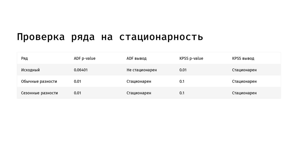 ВыводДля стабилизации дисперсии применено логарифмирование с единичным сдвигом log(x+1), а данные
