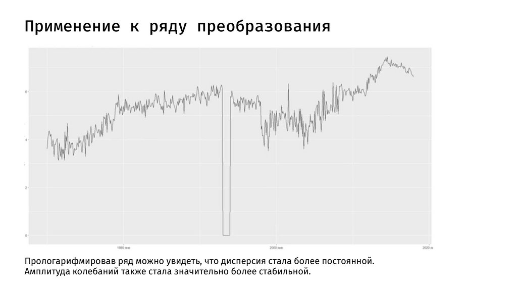 Применение к ряду преобразованияПрологарифмировав ряд можно увидеть, что дисперсия стала более постоянной.