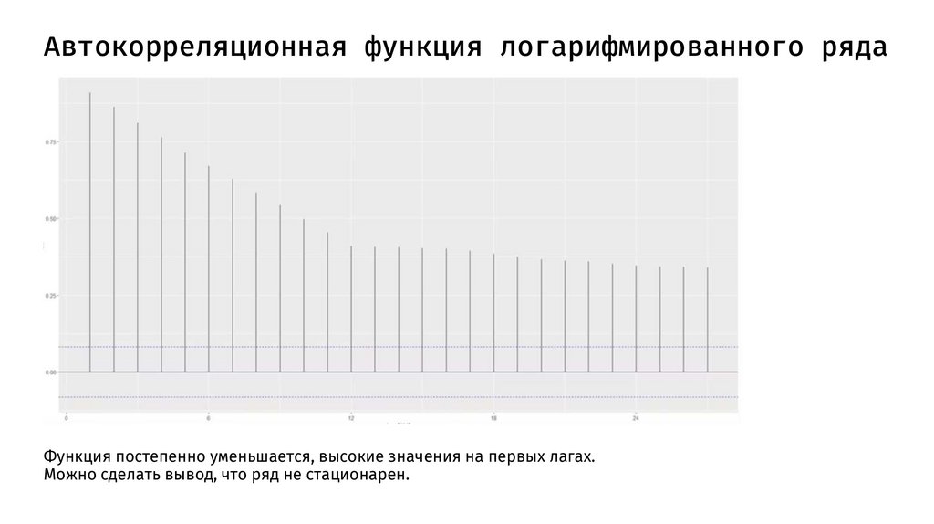 Автокорреляционная функция логарифмированного рядаФункция постепенно уменьшается, высокие значения на первых лагах.