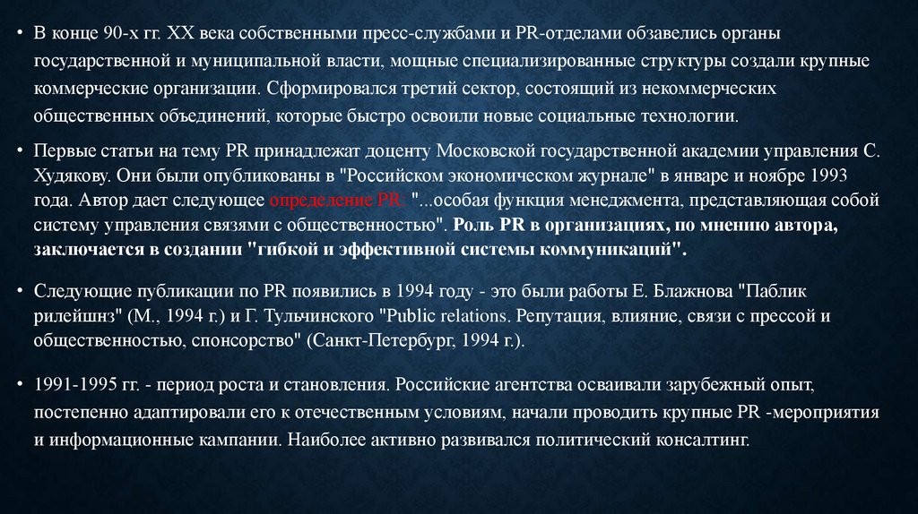 • Первые статьи на тему PR принадлежат доценту Московской государственной академии управления С.