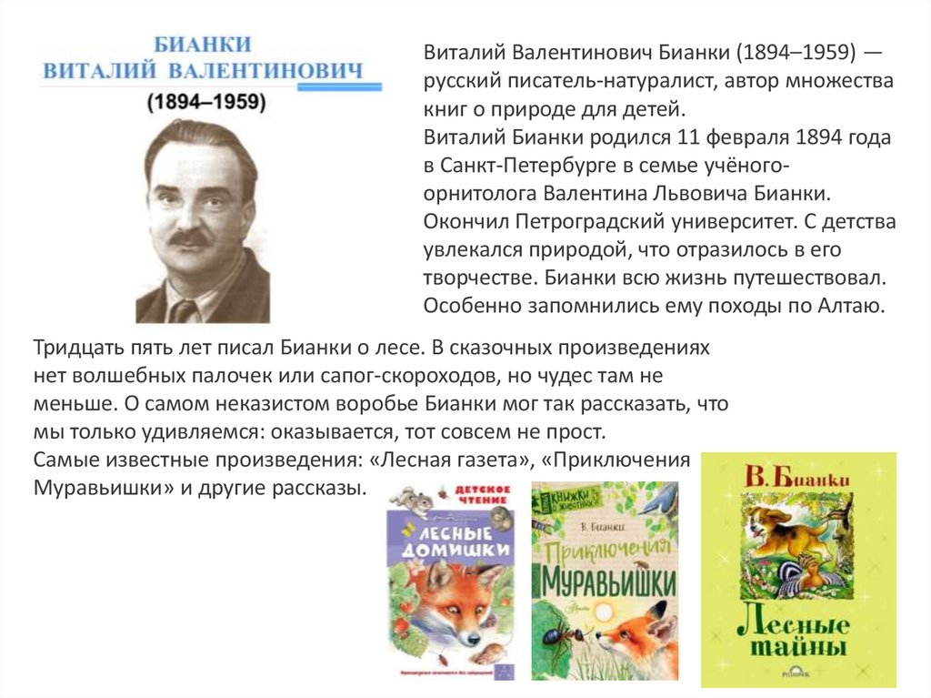 Виталий Валентинович Бианки (1894–1959) —русский писатель-натуралист, автор множества
