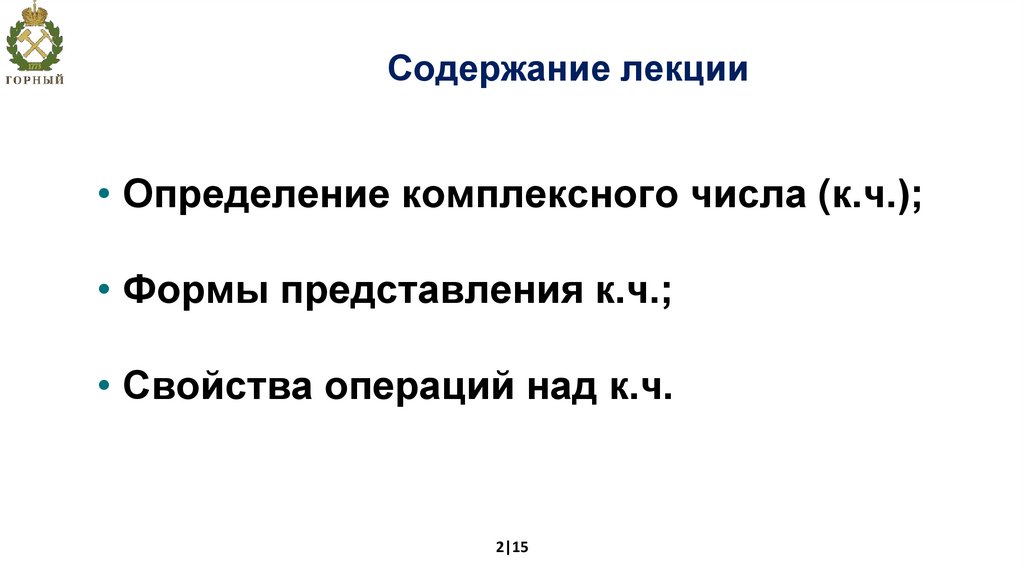 Содержание лекции• Определение комплексного числа (к.ч.);