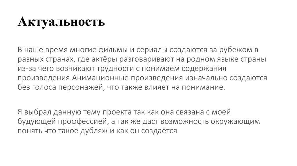 АктуальностьВ наше время многие фильмы и сериалы создаются за рубежом в