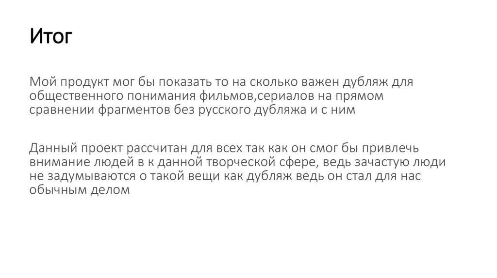 ИтогМой продукт мог бы показать то на сколько важен дубляж для