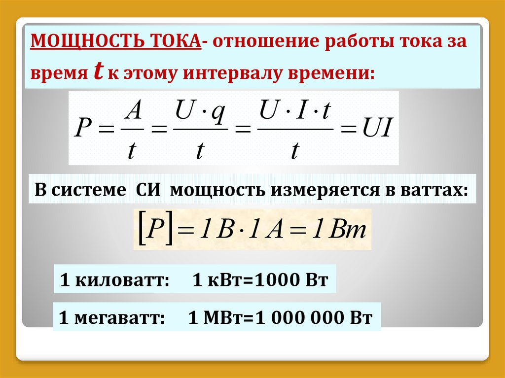 МОЩНОСТЬ ТОКА- отношение работы тока завремя t к этому интервалу времени: