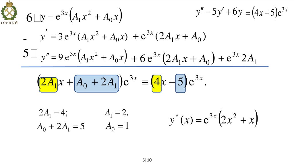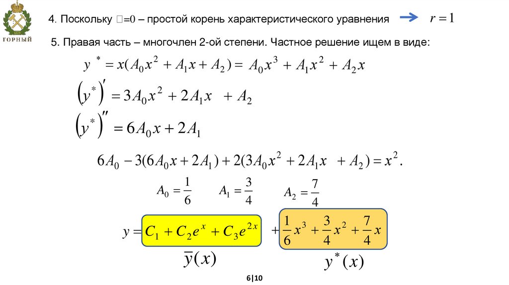 5. Правая часть – многочлен 2-ой степени. Частное решение ищем в виде: