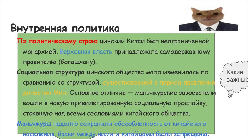 Внутренняя политикаПо политическому строю цинский Китай был неограниченной
