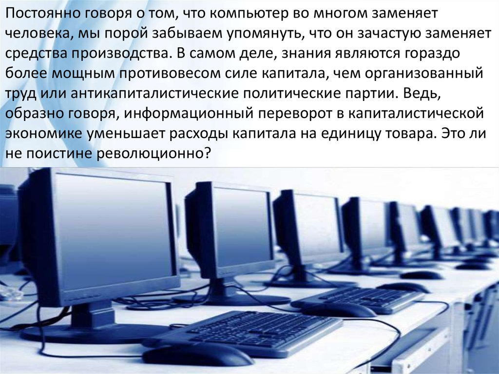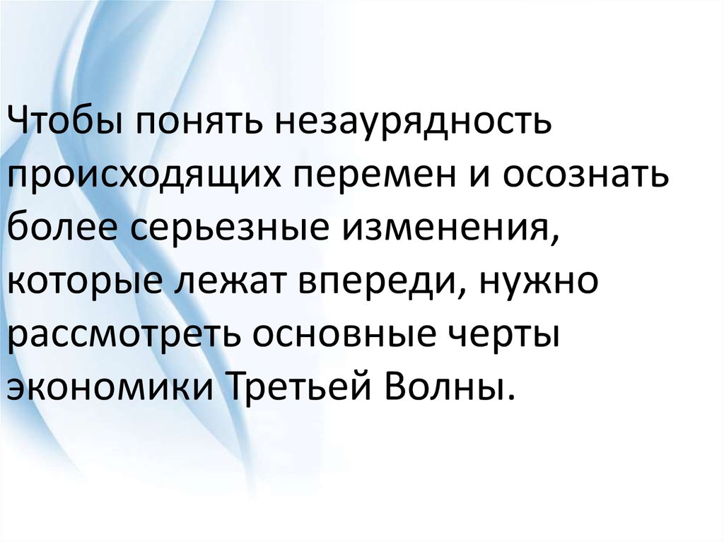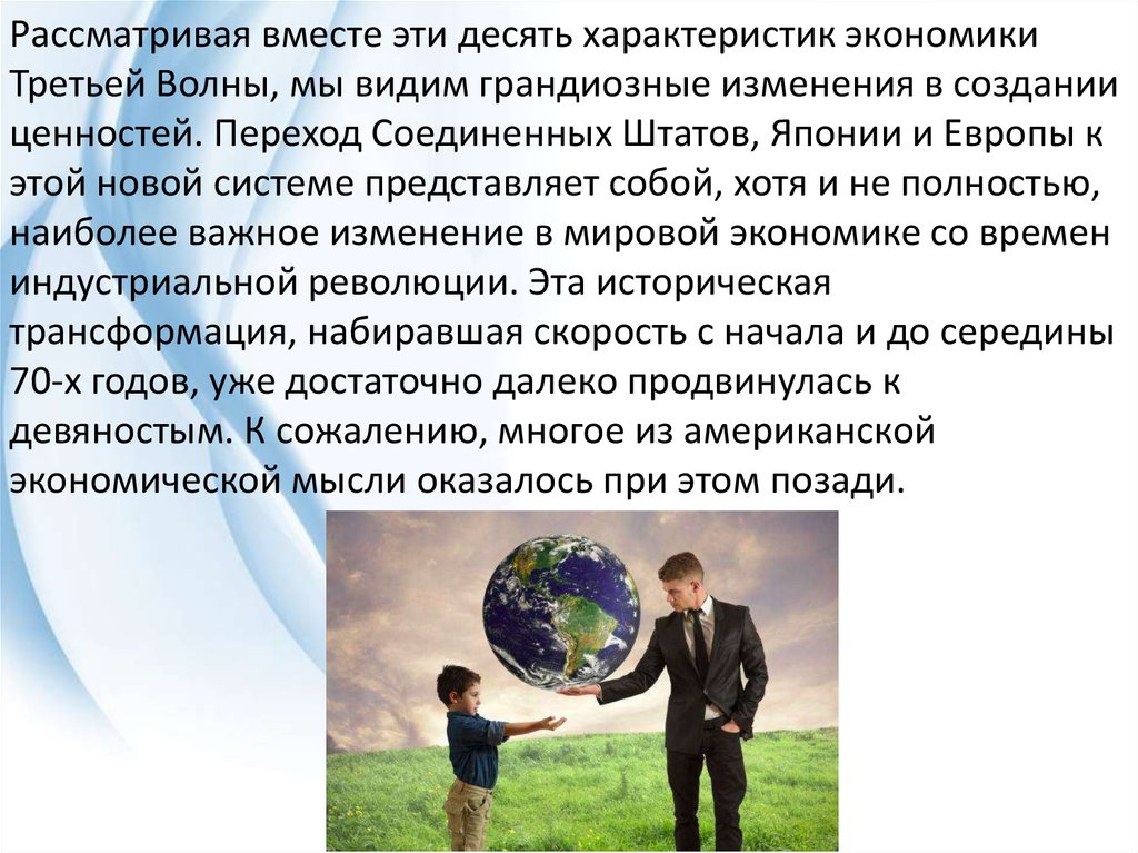 Рассматривая вместе эти десять характеристик экономикиТретьей Волны, мы видим грандиозные изменения в создании