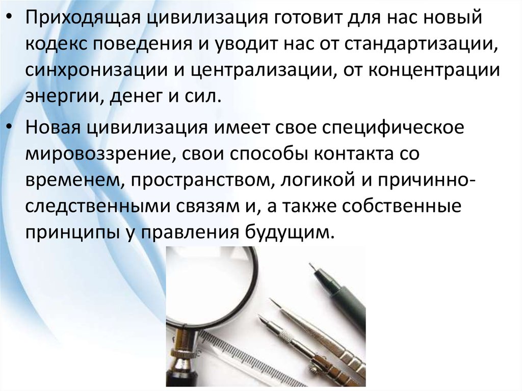 • Приходящая цивилизация готовит для нас новыйкодекс поведения и уводит нас от стандартизации,