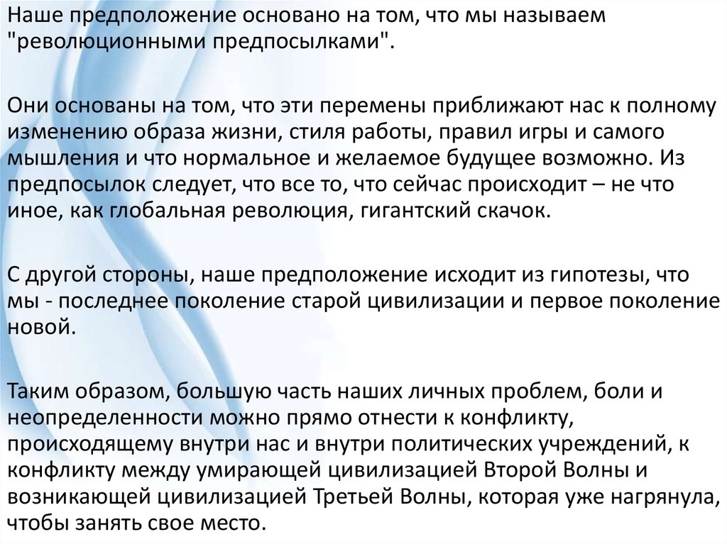 Наше предположение основано на том, что мы называем"революционными предпосылками".