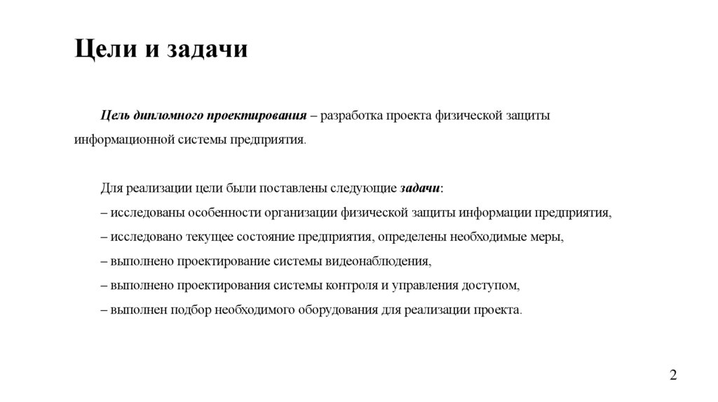 Цели и задачиЦель дипломного проектирования – разработка проекта физической защиты