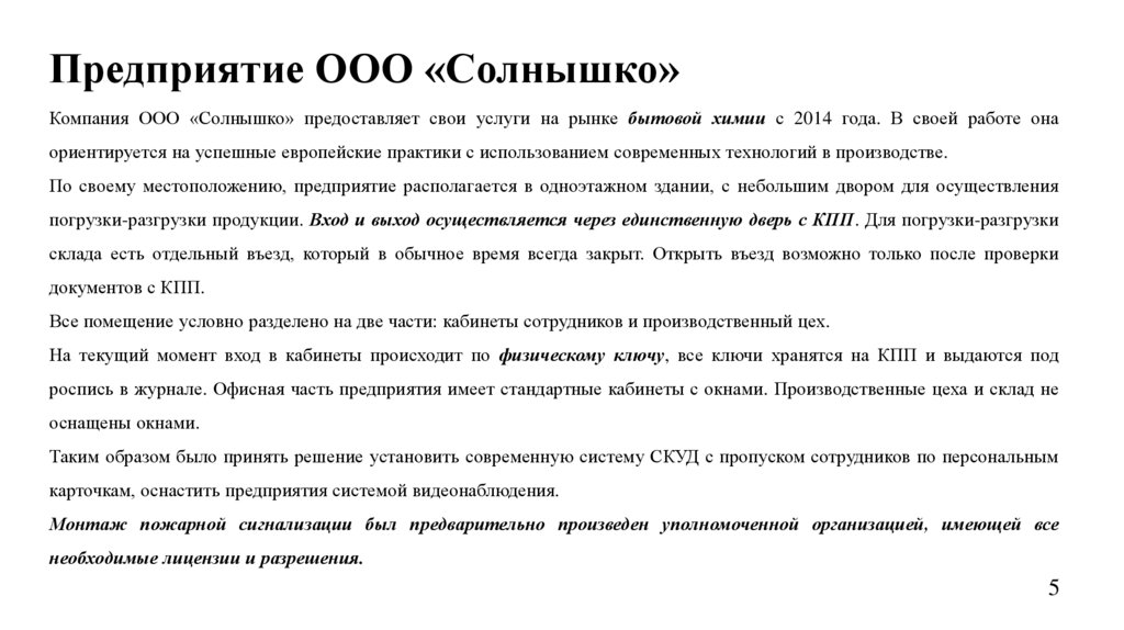 предприятия ООО «Солнышко» согласно требованиям данного предприятия.