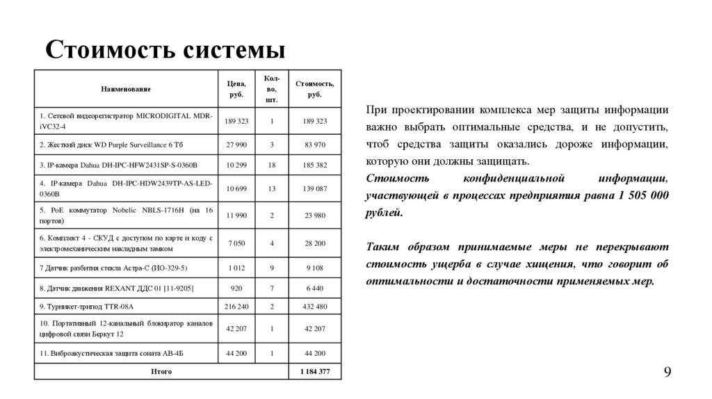 Стоимость системыНаименование