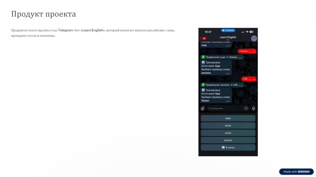 Продукт проектаПродуктом моего проекта стал Telegram-бот «Learn English», который помогает изучать английские слова,