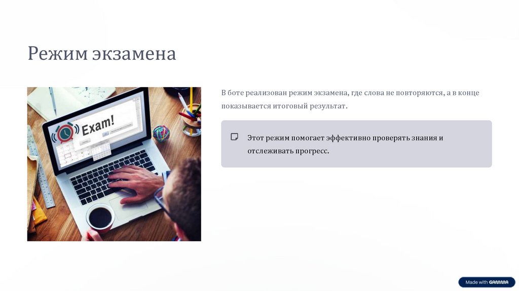 Режим экзаменаВ боте реализован режим экзамена, где слова не повторяются, а в конце
