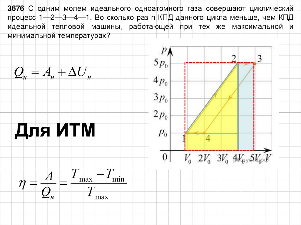3676 С одним молем идеального одноатомного газа совершают циклическийпроцесс 1—2—3—4—1. Во сколько раз n КПД данного цикла меньше, чем КПД