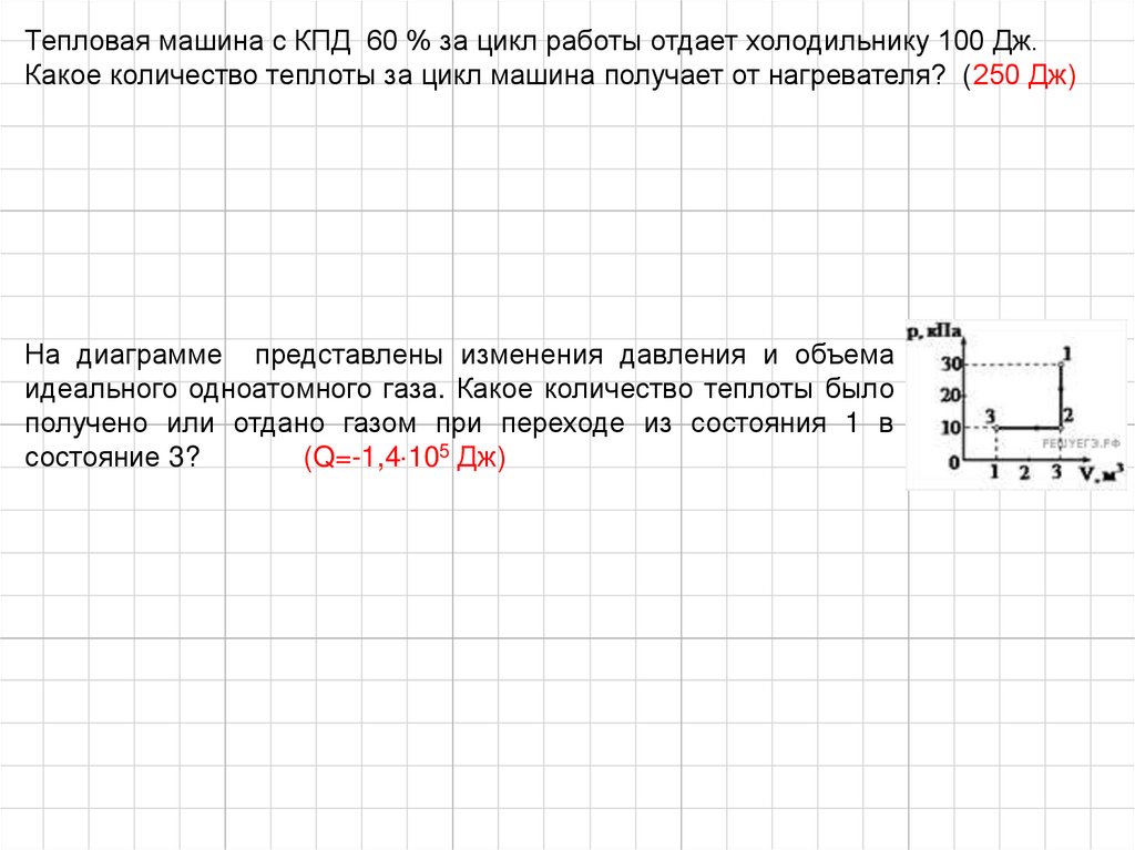 Тепловая машина с КПД 60 % за цикл работы отдает холодильнику 100 Дж.Какое количество теплоты за цикл машина получает от нагревателя? (250 Дж)
