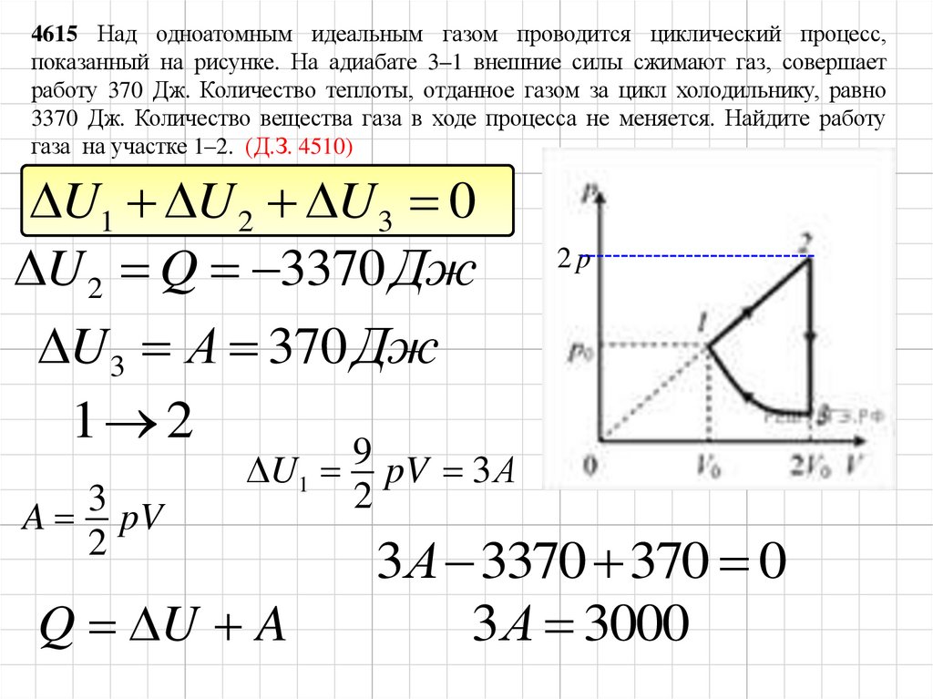 4615 Над одноатомным идеальным газом проводится циклический процесс,показанный на рисунке. На адиабате 3–1 внешние силы сжимают газ, совершает