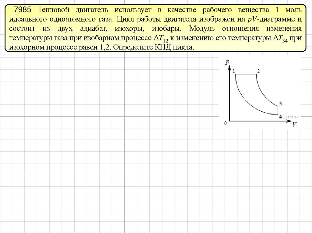 7985 Тепловой двигатель использует в качестве рабочего вещества 1 мольидеального одноатомного газа. Цикл работы двигателя изображён на pV-диаграмме и