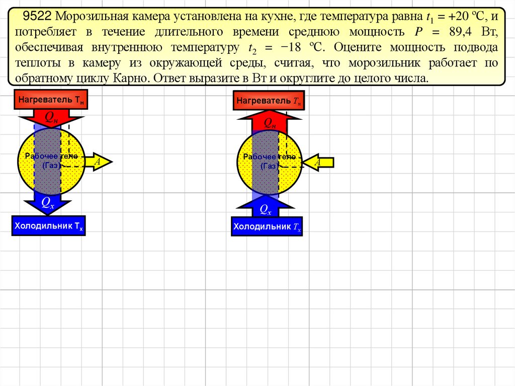 9522 Морозильная камера установлена на кухне, где температура равна t1 = +20 ºС, ипотребляет в течение длительного времени среднюю мощность P = 89,4 Вт,
