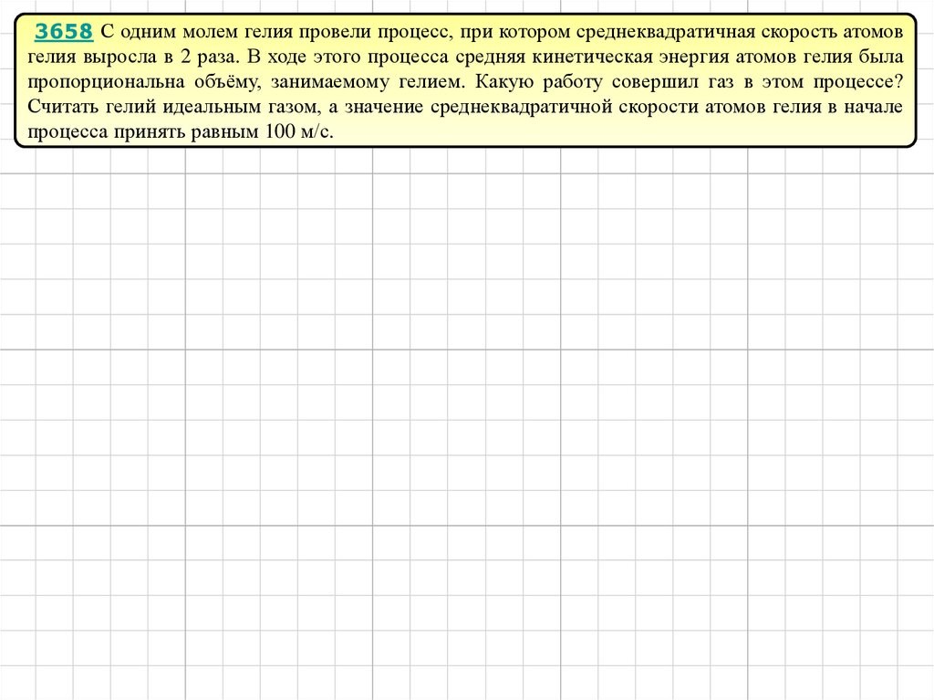 3658 С одним молем гелия провели процесс, при котором среднеквадратичная скорость атомовгелия выросла в 2 раза. В ходе этого процесса средняя кинетическая энергия атомов гелия была