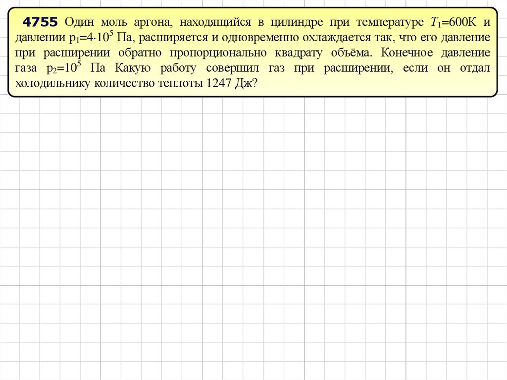 4755 Один моль аргона, находящийся в цилиндре при температуре Т1=600К идавлении р1=4 105 Па, расширяется и одновременно охлаждается так, что его давление