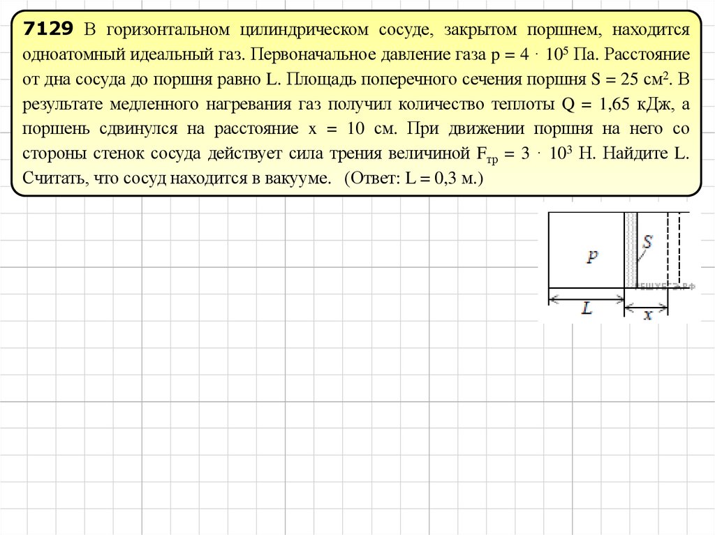 7129 В горизонтальном цилиндрическом сосуде, закрытом поршнем, находитсяодноатомный идеальный газ. Первоначальное давление газа p = 4 · 105 Па. Расстояние