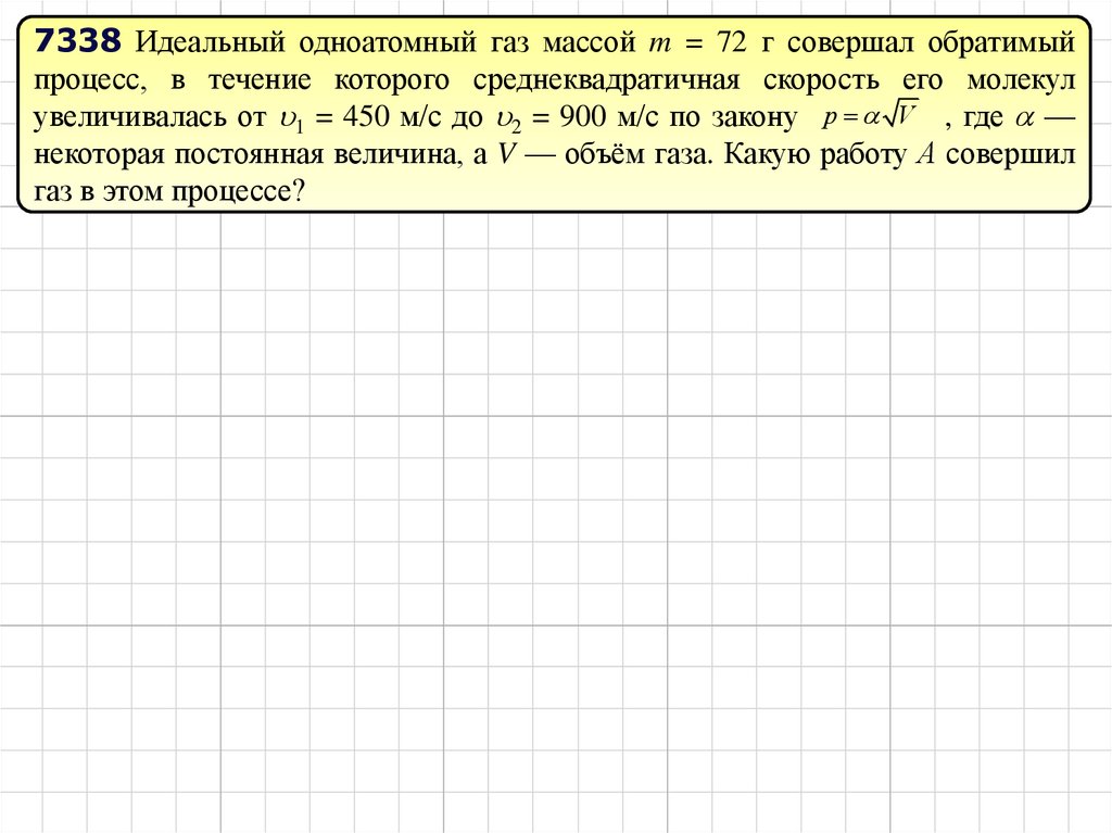 7338 Идеальный одноатомный газ массой m = 72 г совершал обратимыйпроцесс, в течение которого среднеквадратичная скорость его молекул