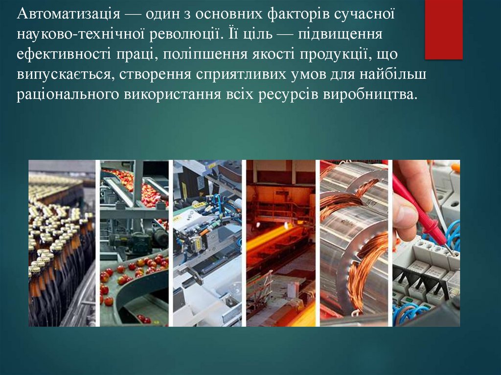 Автоматизація — один з основних факторів сучасноїнауково-технічної революції. Її ціль — підвищення