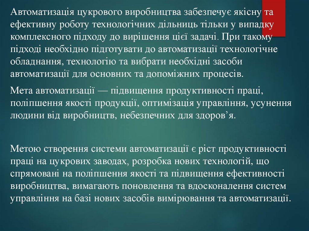 Автоматизація цукрового виробництва забезпечує якісну таефективну роботу технологічних дільниць тільки у випадку