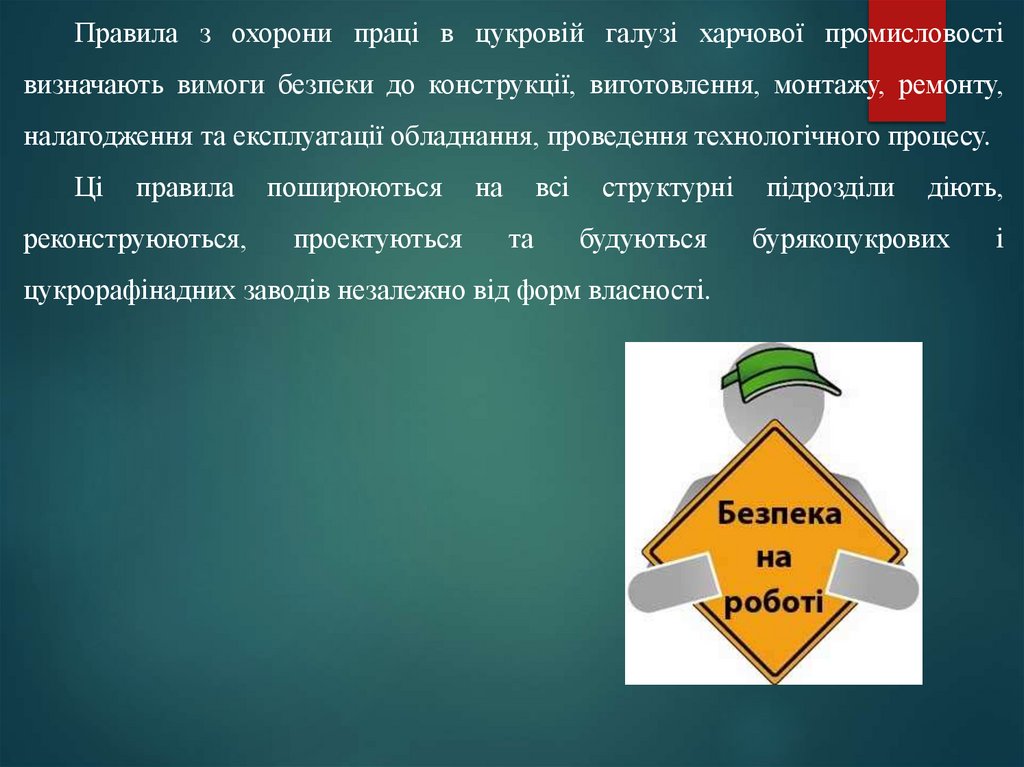 Правила з охорони праці в цукровій галузі харчової промисловостівизначають вимоги безпеки до конструкції, виготовлення, монтажу, ремонту,