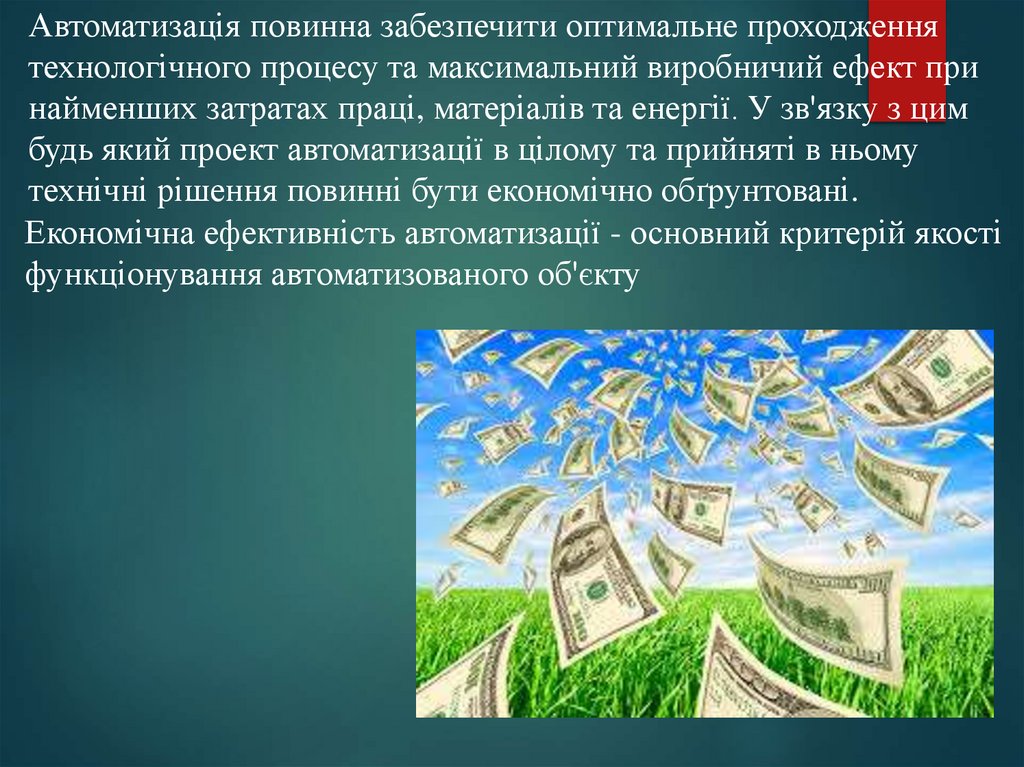 Автоматизація повинна забезпечити оптимальне проходженнятехнологічного процесу та максимальний виробничий ефект при