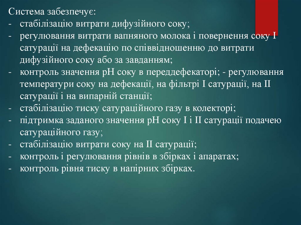 Система забезпечує:- стабілізацію витрати дифузійного соку;