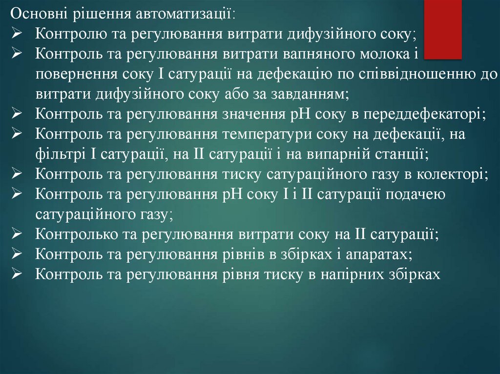 Основні рішення автоматизації:Контролю та регулювання витрати дифузійного соку;