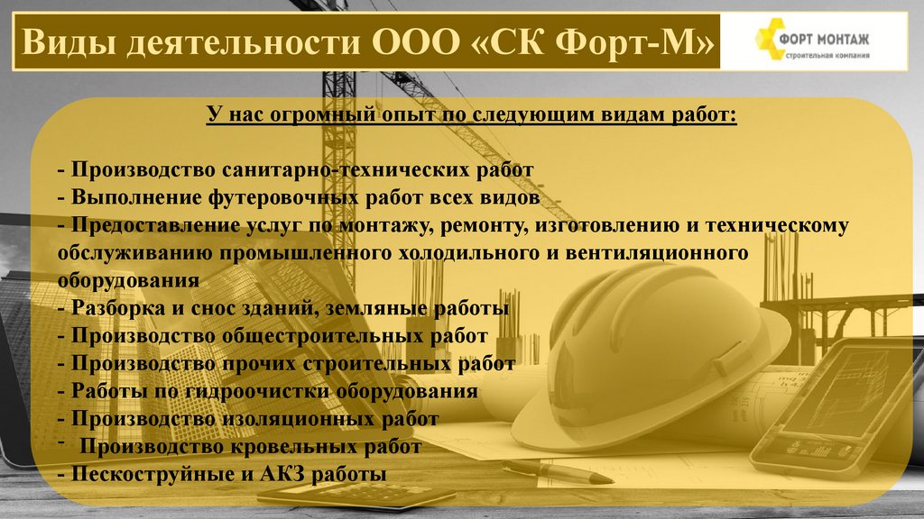 Виды деятельности ООО «СК Форт-М»У нас огромный опыт по следующим видам работ: