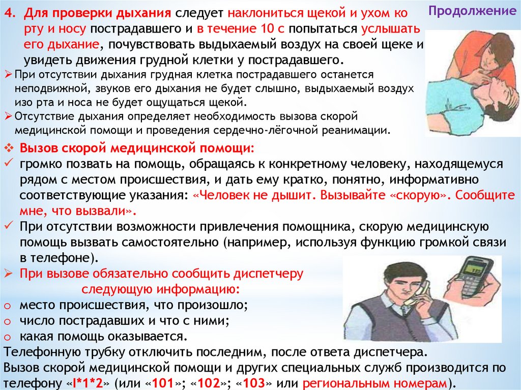 Продолжение4. Для проверки дыхания следует наклониться щекой и ухом ко