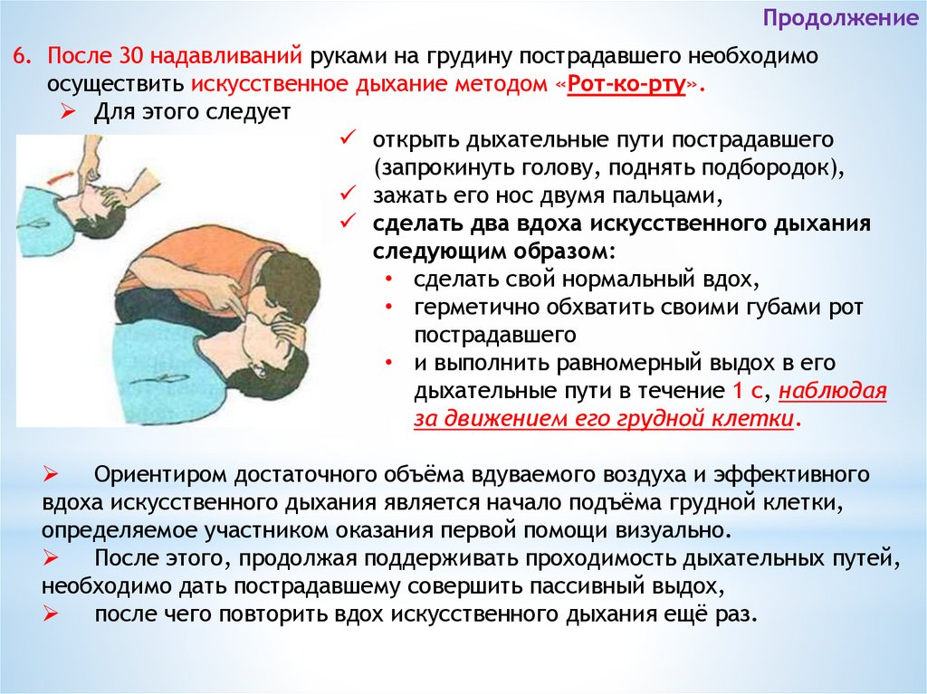 Продолжение6. После 30 надавливаний руками на грудину пострадавшего необходимо