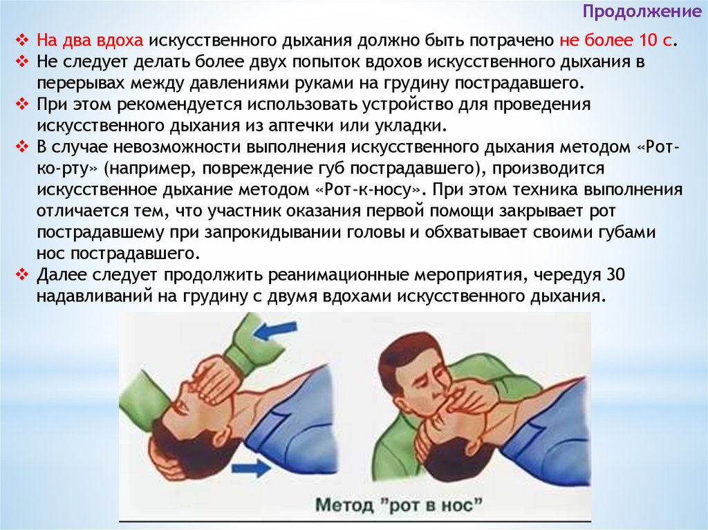 ПродолжениеНа два вдоха искусственного дыхания должно быть потрачено не более 10 с.