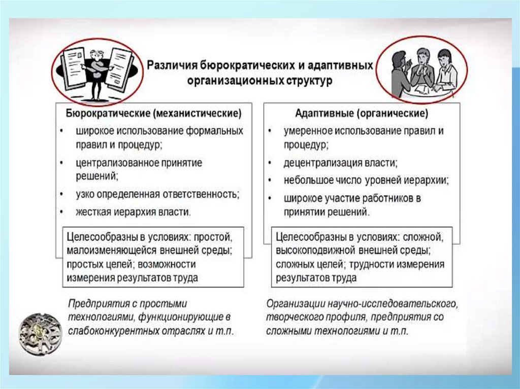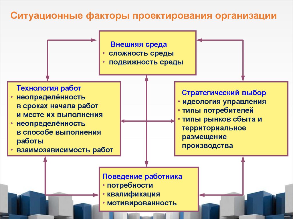 технологии, поставленные цели, размер организации, влияние внешней среды. С учетом этих