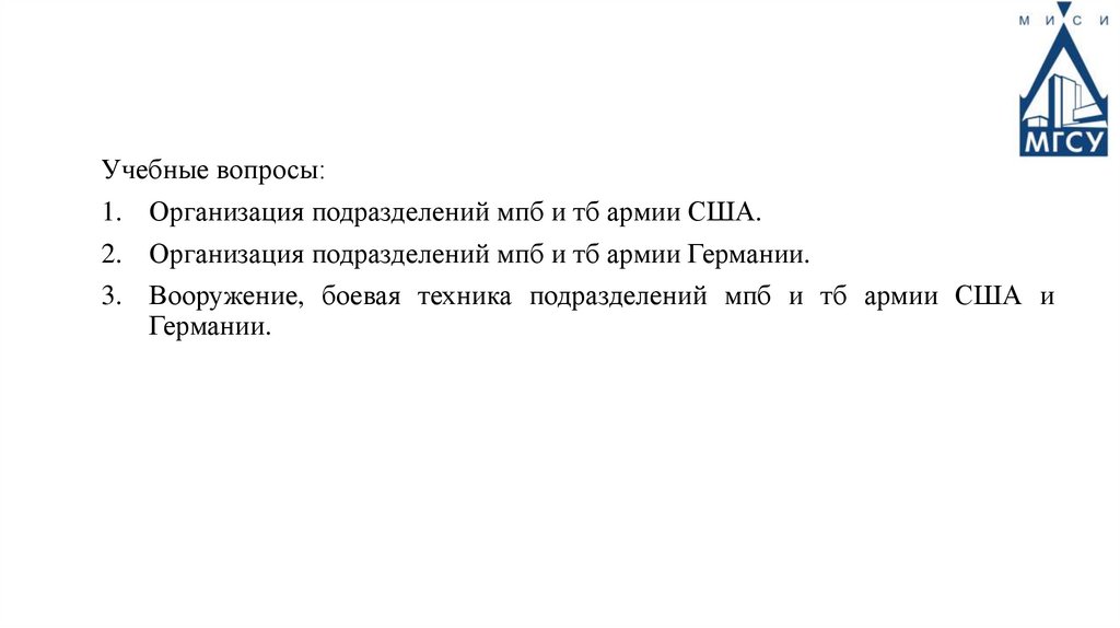 Учебные вопросы:1. Организация подразделений мпб и тб армии США.