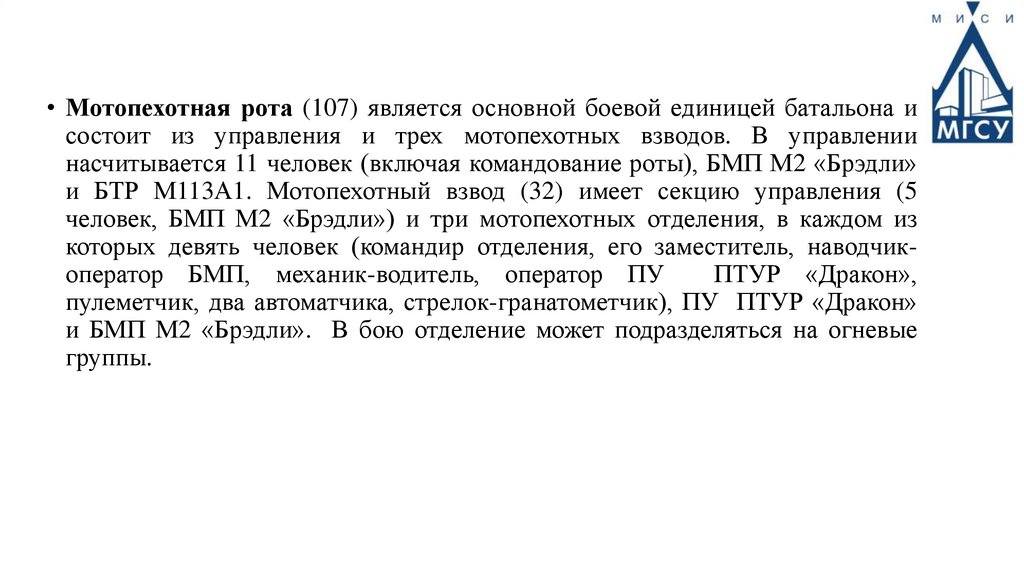 • Мотопехотная рота (107) является основной боевой единицей батальона исостоит из управления и трех мотопехотных взводов. В управлении