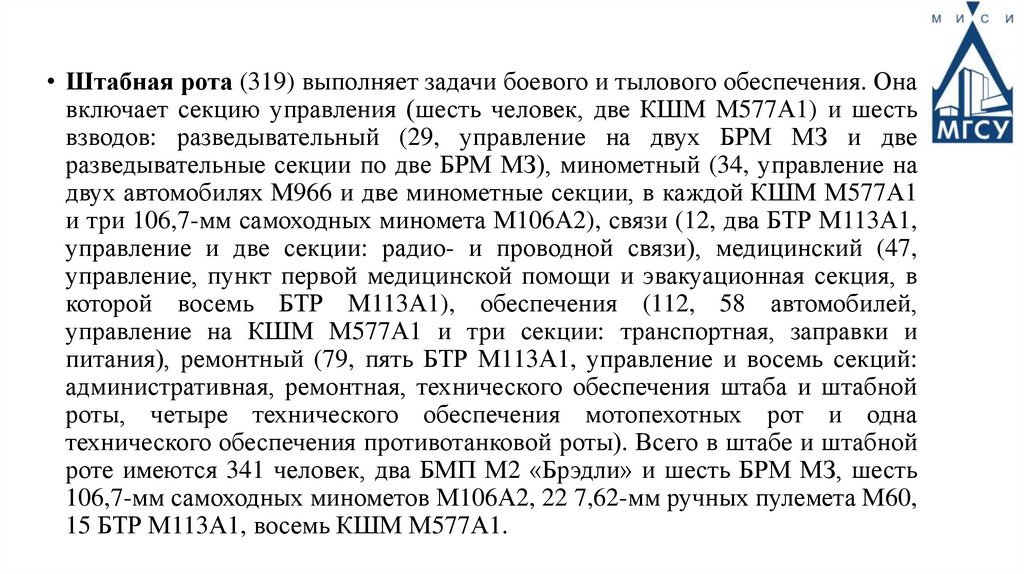 • Штабная рота (319) выполняет задачи боевого и тылового обеспечения. Онавключает секцию управления (шесть человек, две КШМ М577А1) и шесть