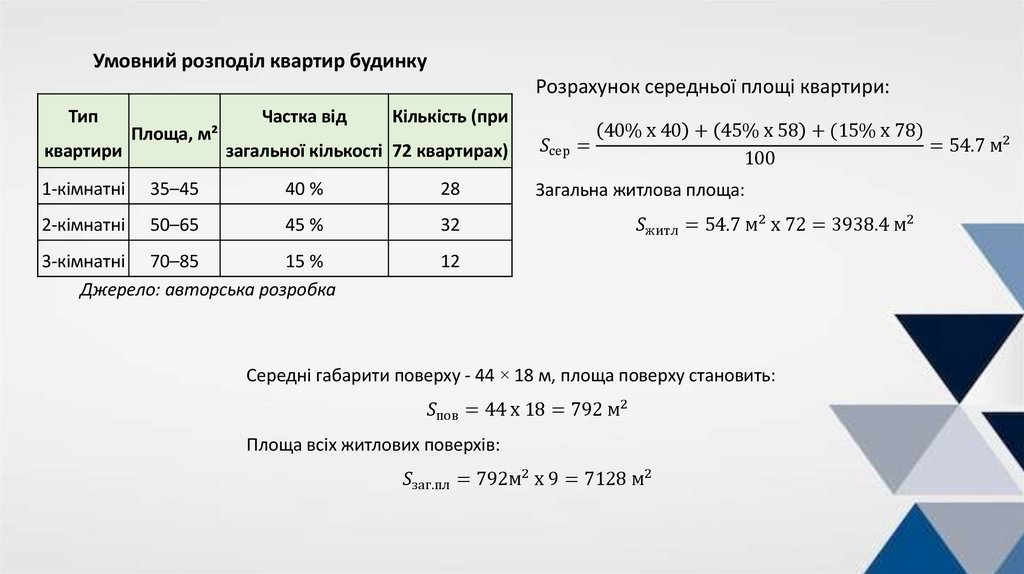 Умовний розподіл квартир будинкуРозрахунок середньої площі квартири: