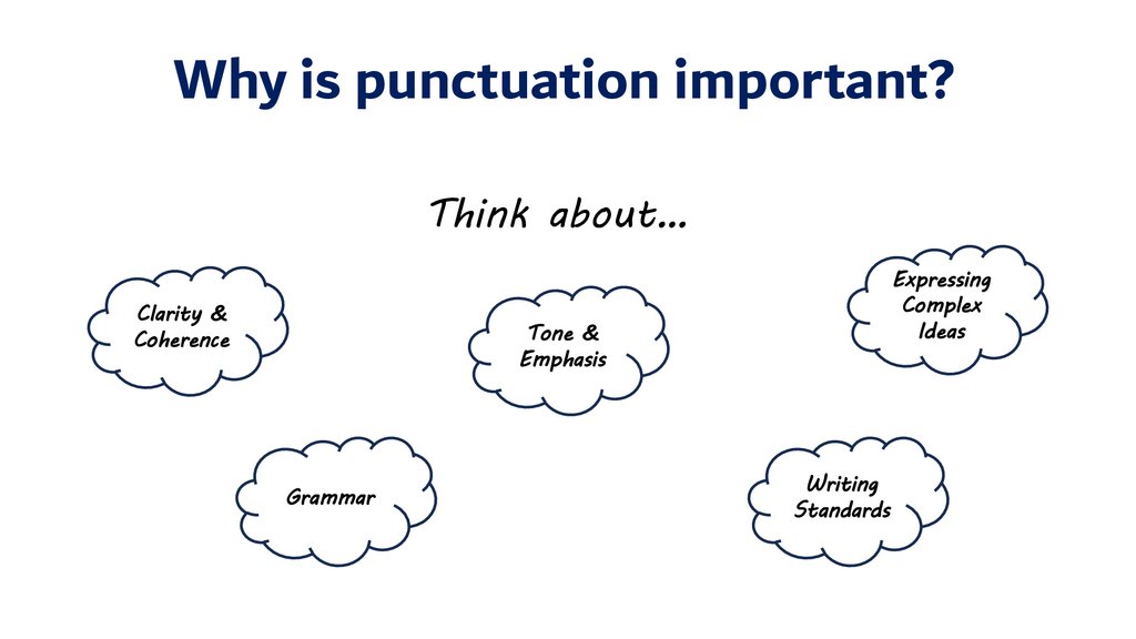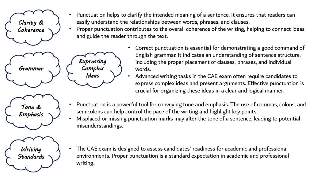 • Proper punctuation contributes to the overall coherence of the writing, helping to connect ideas