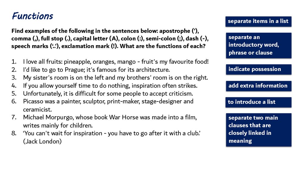 FunctionsFind examples of the following in the sentences below: apostrophe (’),