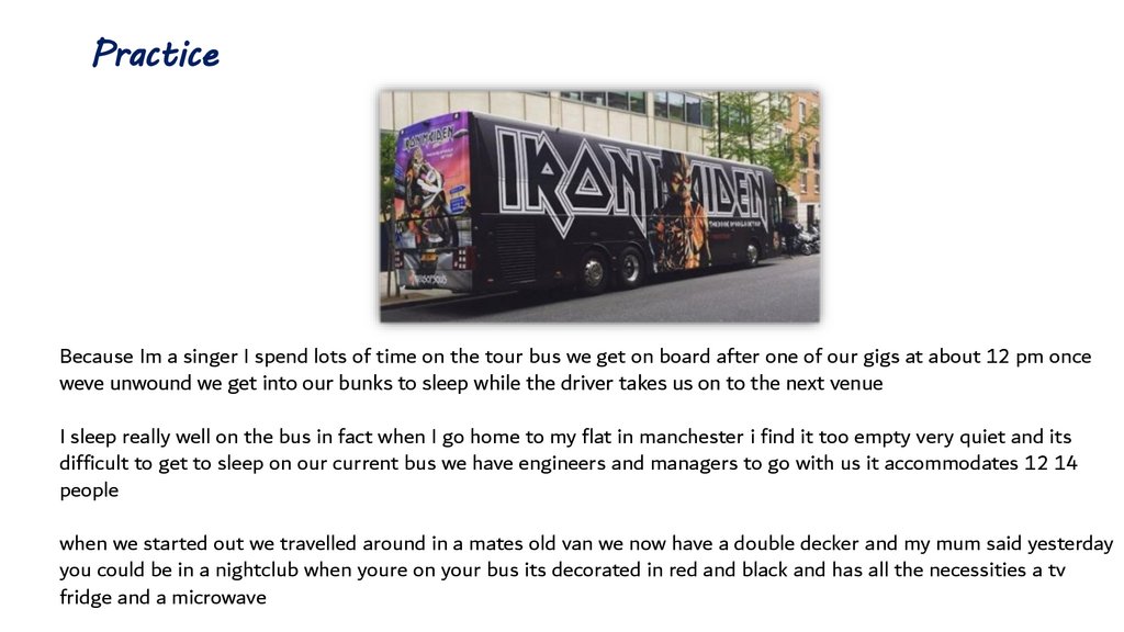 PracticeBecause Im a singer I spend lots of time on the tour bus we get on board after one of our gigs at about 12 pm once