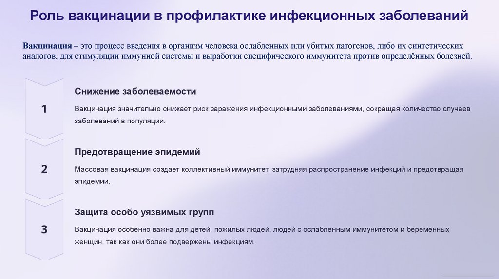 Роль вакцинации в профилактике инфекционных заболеванийВакцинация – это процесс введения в организм человека ослабленных или убитых патогенов, либо их синтетических